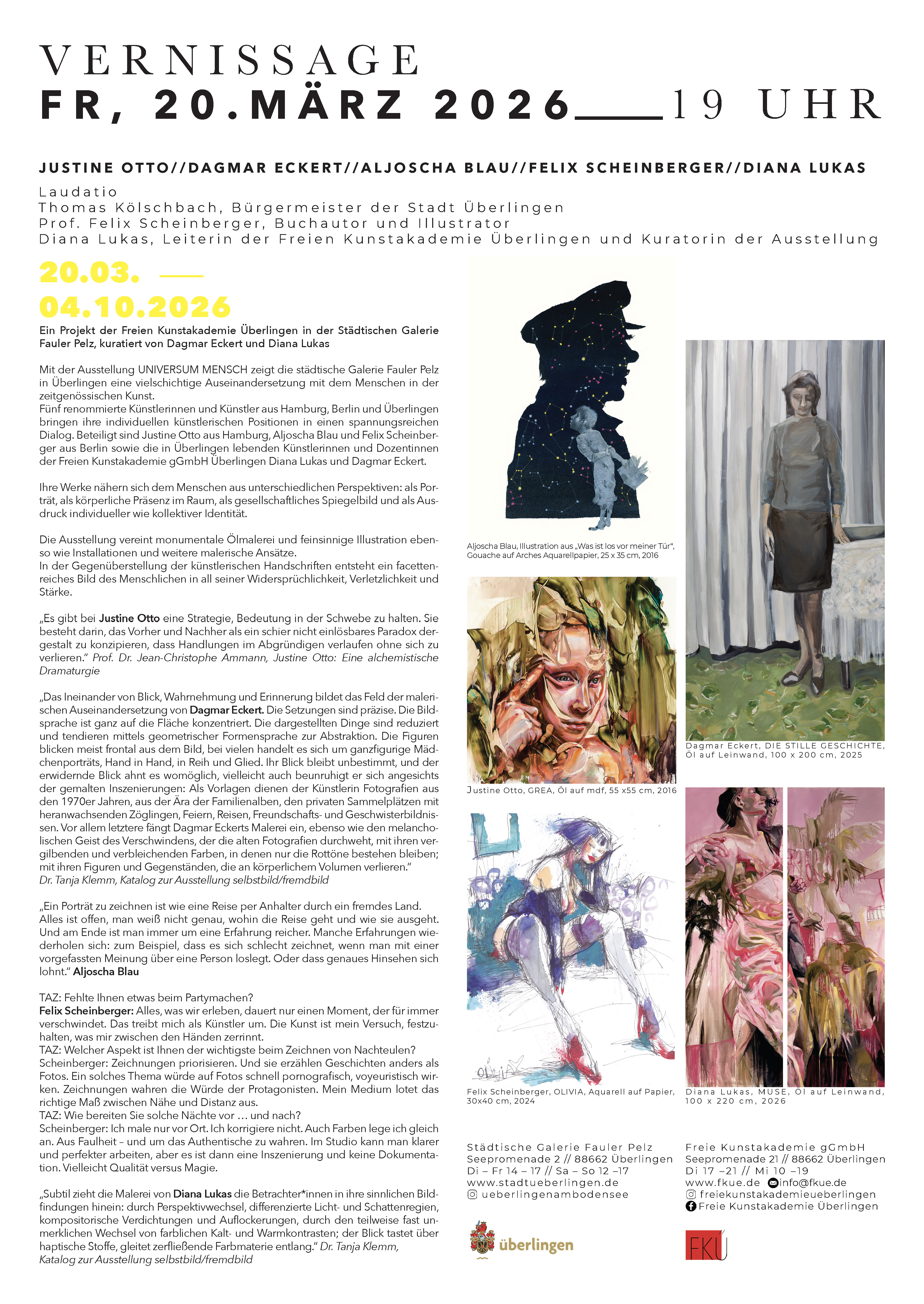 Die Sonderausstellung „UNIVERSUM MENSCH“ vereint überregional renommierte, gegenständlich arbeitende Künstlerinnen und Künstler: Justine Otto (Hamburg), Aljoscha Blau (Berlin) und Felix Scheinberger (Berlin) sowie die beiden in Überlingen lebenden Künstlerinnen und Dozentinnen der Freien Kunstakademie gGmbH Überlingen Diana Lukas und Dagmar Eckert. Scheinberger lehrt als Professor Zeichnen und Illustration am Fachbereich Design der Fachhochschule Münster, Blau hat Lehraufträge an verschiedenen Instituten im In- und Ausland, Otto stellt seit über zwei Jahrzehnten in renommierten Museen und Ausstellungshäusern aus. Alle drei Künstler:innen wurden mit mehreren Auszeichnungen geehrt.